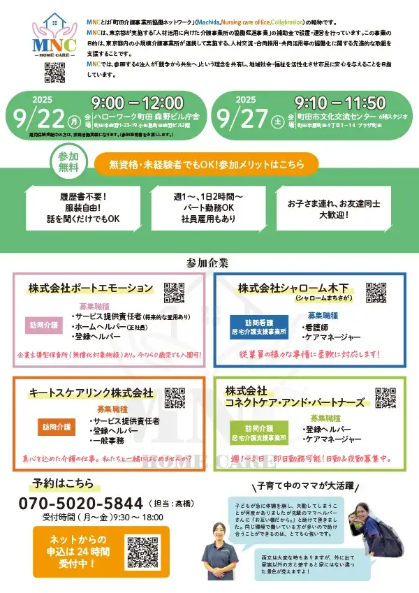 募集職種はホームヘルパー・登録ヘルパー・看護師・ケアマネージャー等で、4つの参加企業より説明を聞くことができます。